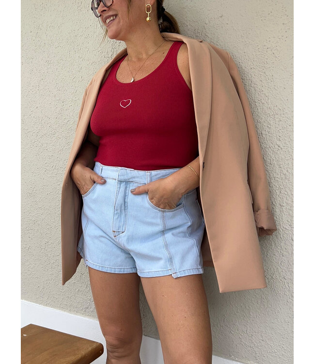 Fitted Tank Top crafted from soft, ribbed stretch fabric that hugs the body comfortably. Its minimalist design is elevated with delicate heart embroidery on the front, adding a subtle feminine touch. Perfect worn alone or layered with blazers, shorts or
