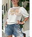 White blouse with sand-tone floral embroidery at the front, designed with short puff sleeves, a round neckline, and a comfortable, flattering fit. Crafted from soft, breathable fabrics ideal for everyday wear or special occasions. Self: 100% Cotton. Contrast 1: 95% Cotton, 5% Spandex.