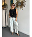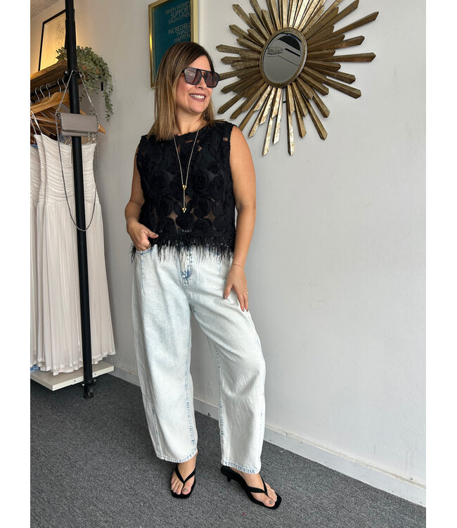Sleeveless black blouse featuring an elegant lace texture with flowers and a delicate fringe hem. Lightweight and stylish, perfect to elevate casual looks or pair with denim for a chic, modern outfit.