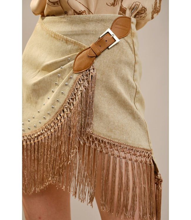 Wrap-style mini skirt in lightweight stretch denim with asymmetrical hem and bold macrame fringe trim. Features a tan faux leather side belt with gold buckle detail for adjustable fit and added style.