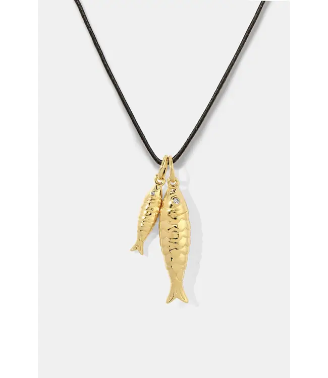 A sculptural golden fish pendant reimagined on a sleek black cord. The design plays with contrast polished detail against a minimal silhouette bringing quiet strength and symbolism. Light, transitional, and easy to layer, it reflects the effortless rhythm of Pre-Fall.