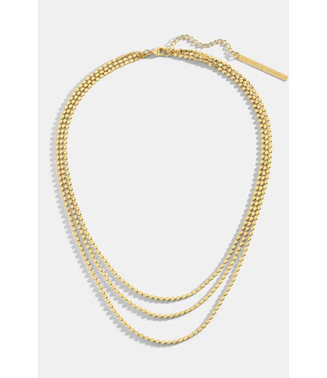 The Flat Beaded Trio is a high quality gold plated chain composed of three chains with different lengths, 15" / 16" / 18", attached together with a 2" extender.