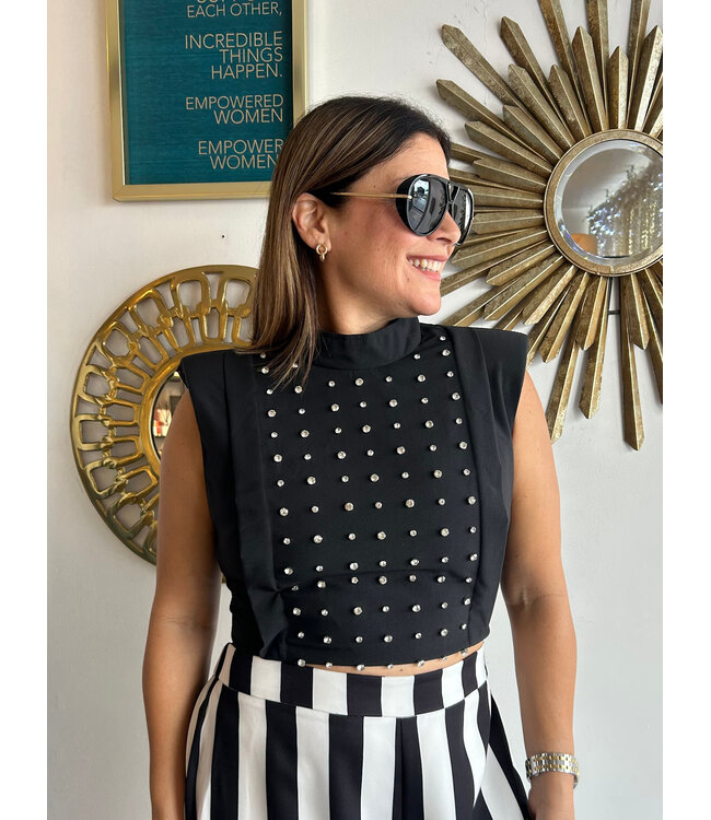 Padded Shoulder Rhinestones Top Black