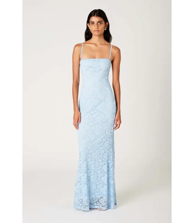 -Stretch lace fabric with soft lining-Maxi length-Square neckline-Slim adjustable straps with tie detail-Form-fitting silhouette